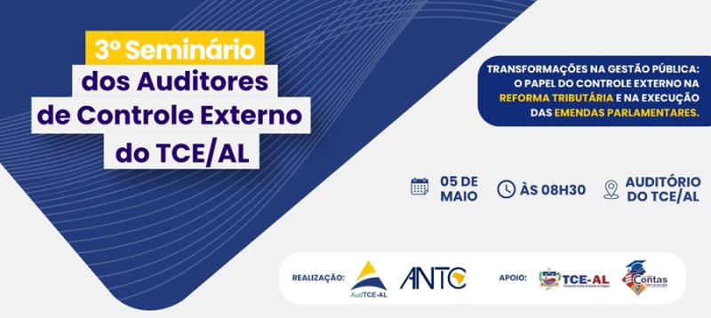 A Associação de Auditores do Tribunal de Contas de Alagoas (AudTCE/AL), promove o 3º Seminário dos Auditores de Controle Externo, consolidando mais uma edição de um espaço estratégico de debate e atualização sobre os desafios contemporâneos da administração pública. O evento acontece dia 05 de maio, às 8h30 no Auditório do TCE/AL.