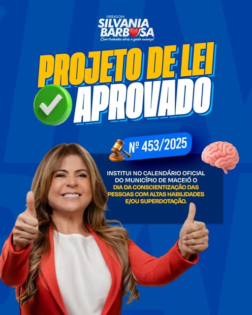 A Câmara Municipal de Maceió aprovou o Projeto de Lei de minha autoria que institui no calendário oficial o Dia Municipal de Conscientização das Pessoas com Altas Habilidades e/ou Superdotação.
